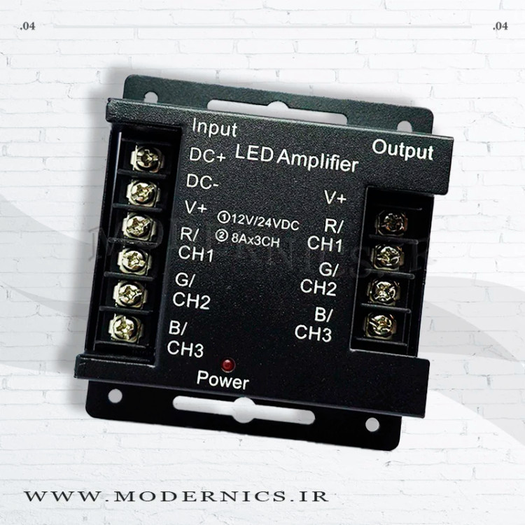 یک تقویتکننده حرفهای و پرقدرت برای سیستمهای نورپردازی RGB است. این محصول با قابلیت کار در دو محدوده ولتاژ 12 و 24 ولت و توانایی تحمل جریان تا 24 آمپر، امکان کنترل صدها متر ریسه نواری RGB را تنها با یک سیگنال کنترل فراهم میکند. طراحی صنعتی و عملکرد پایدار، آن را به انتخابی ایدهآل برای پروژههای نورپردازی حرفهای و بزرگ تبدیل کرده است.